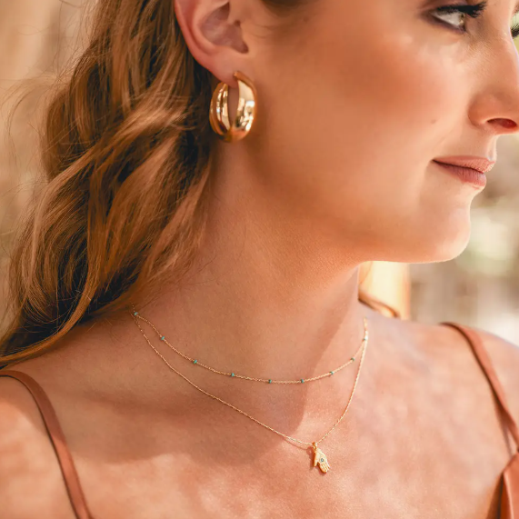 This tiny hand pendant measures approximately .5" and it's set with a Czech crystal in turquoise. It hangs from an 18" 14k gold-plated brass chain coated to resist tarnish and create a hypoallergenic surface. Designed and assembled in Sonoma California.